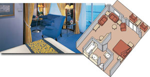 2 lower beds convertible to 1 king-size bed, walk-in closet, bath with tub and shower, two sinks, sitting area, 1 sofa bed, private verandah, refrigerator, floor-to-ceiling windows. * 488 sq. ft. with verandah.